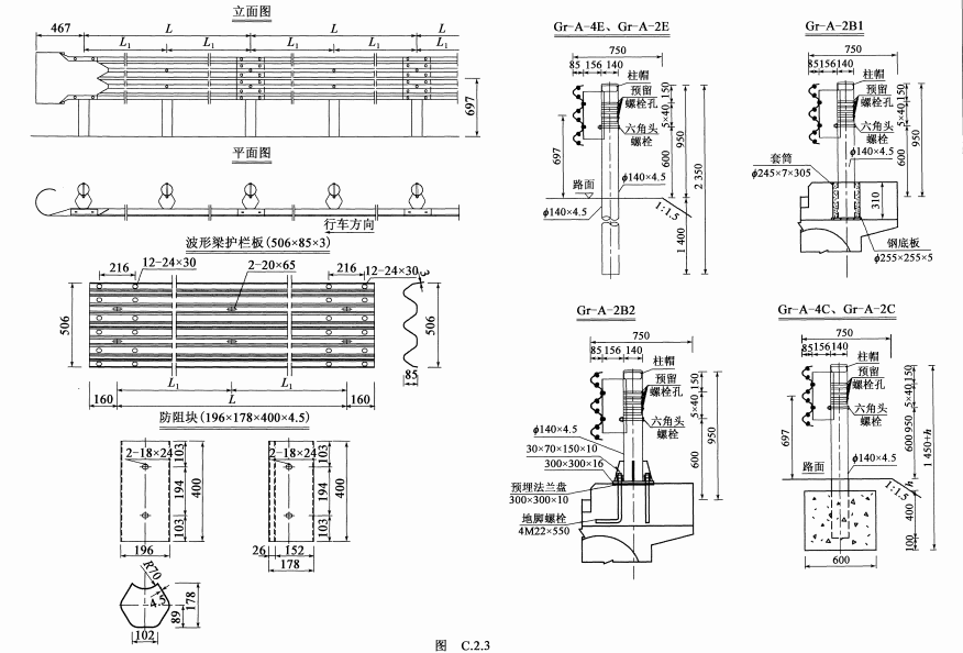 三(A)級a型波形梁護欄一般構造示例如圖(雙胞胎防阻塊式):