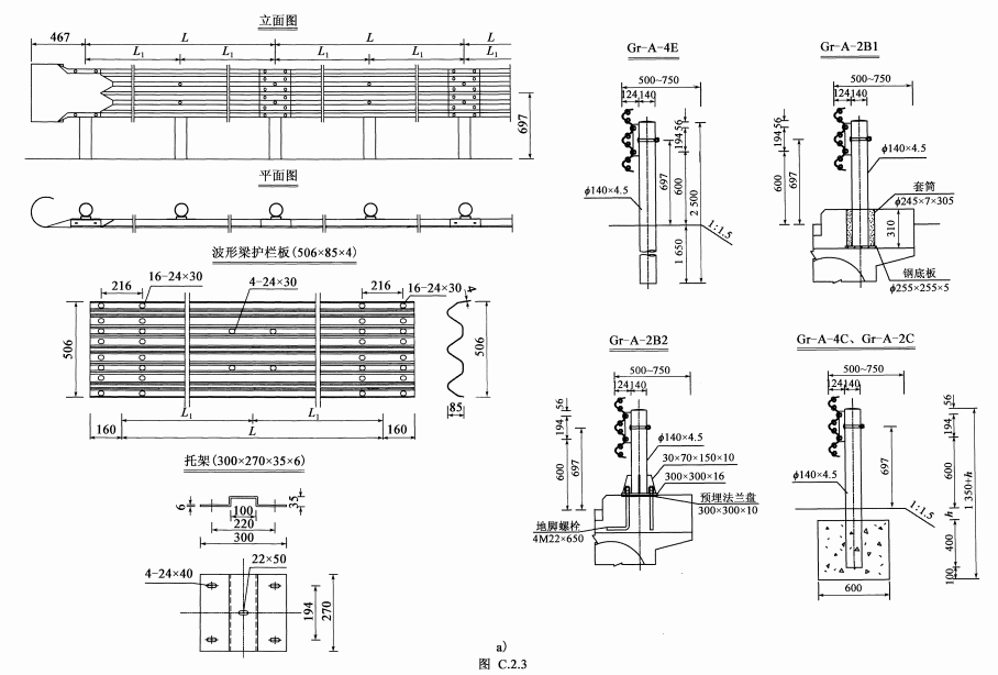 三(A)級b型波形梁護欄一般構造示例如圖(三波大托架式):