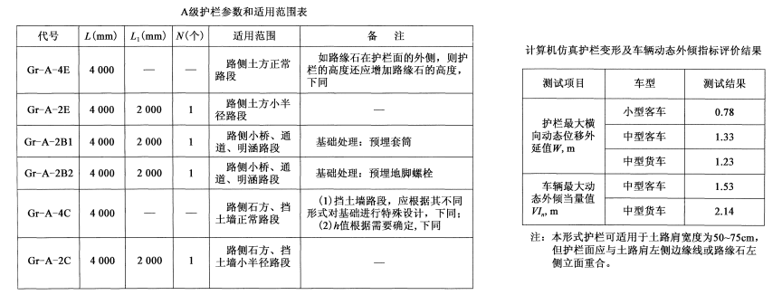 三(A)級a型波形梁護欄規格參數及適用范圍:
