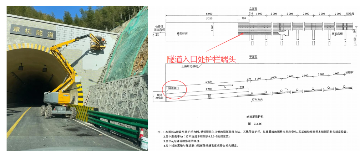 1) 隧道人口處的路側波形梁護欄宜漸變向隧道延伸,在隧道洞口處設置與檢修道斷面相匹配的過渡翼墻。