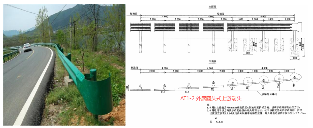 2) 行車方向下游端頭可采用圓頭式可與標準段護欄成一直線設置。二級公路考慮對向交通駛出路外碰撞的可能性,也可做成外展圓頭式。