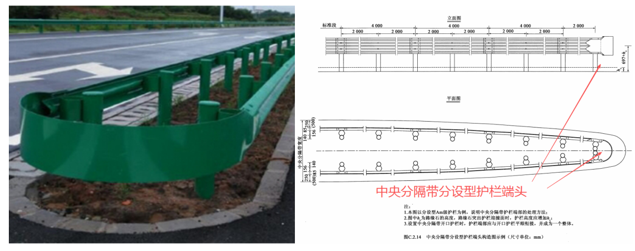 設置于中央分隔帶起點、終點及開口處護欄的端頭處理,應符合下列規定:
